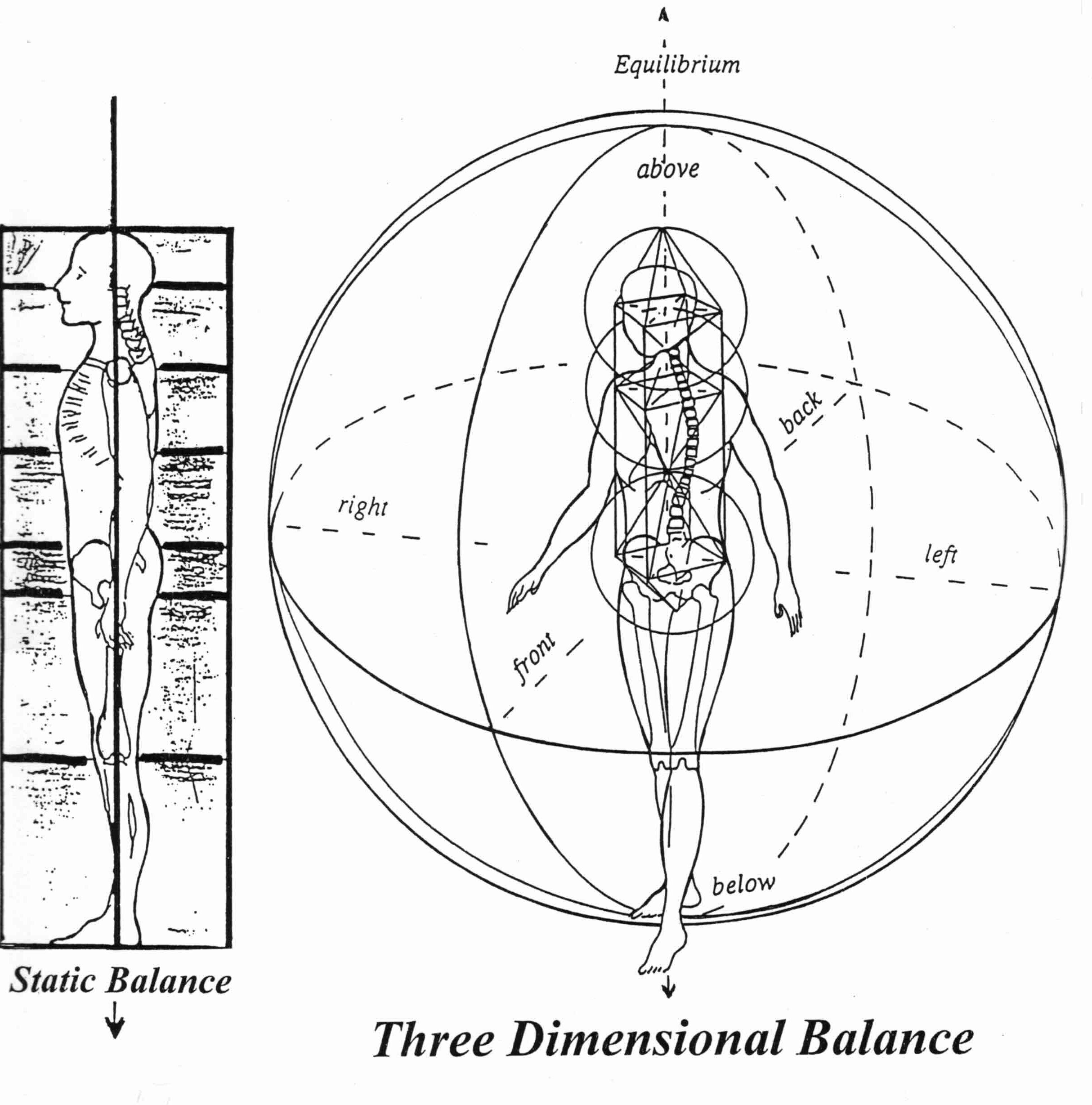 Cristiam further saw that within our human experience the search we have had to find “balance” has been illusive. And that if we think of balance as, for example, an achievement of good posture we will never find it. As shown in another early graphic below, true human physical balance depends on equal three-dimensional centering of the whole body. The figures to the left and right of center are having individual experiences relative to the center. These individual interpretations inevitably produce stress in one form or another.