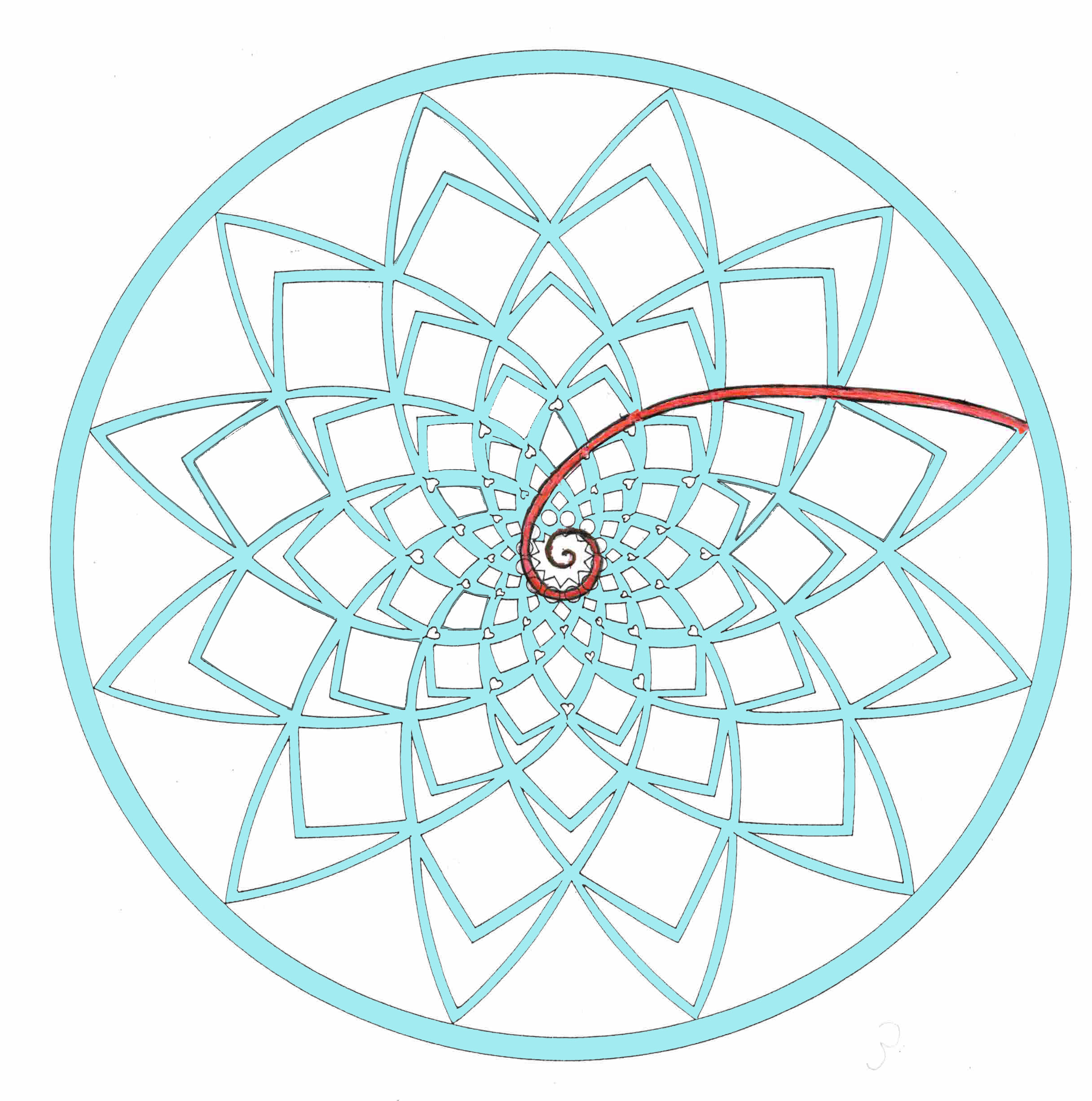 As I became overtaken by this vision, I decided to used the Fibonacci spiral to draw and create the form of the Mandala.