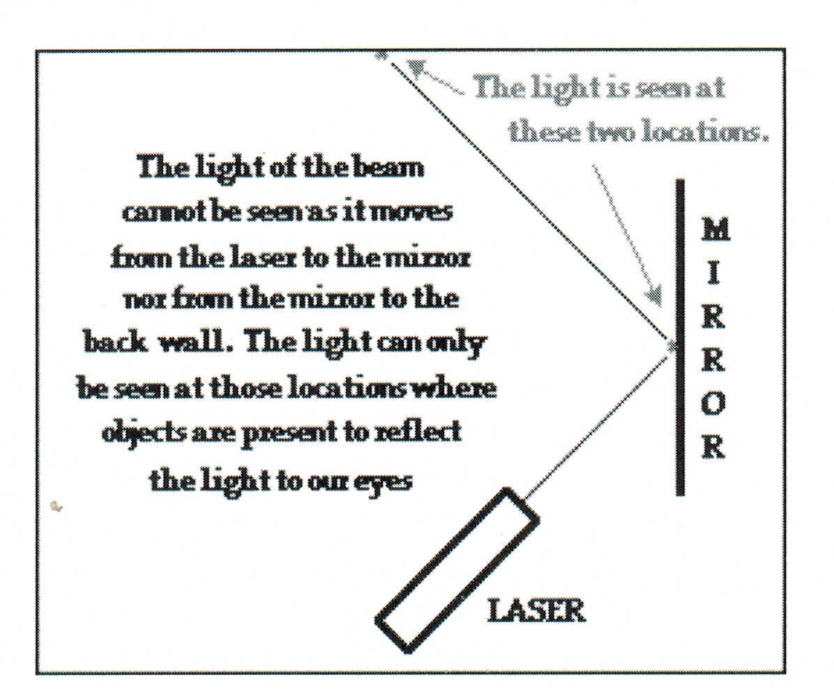 A common Physics demonstration involves the directing of a laser beam across the room. With the room lights off, the laser is turned on and its beam is directed towards a plane mirror. The presence of the light beam cannot be detected as it travels towards the mirror. Furthermore, the light beam cannot be detected after reflecting off the mirror and traveling through the air towards a wall in the room. The only locations where the presence of the light beam can be detected are at the location where the light beam strikes the mirror and at the location where the light beam strikes a wall. At these two locations, a portion of the light in the beam is reflecting off the objects (the mirror and the wall) and traveling towards the students' eyes. And since the detection of objects is dependent upon light traveling from that object to the eye, these are the only two locations where one can detect the light beam. But in between the laser and the mirror, the light beam cannot be detected. There is nothing present in the region between the laser and the mirror that is capable of reflecting the light of the beam to students' eyes.