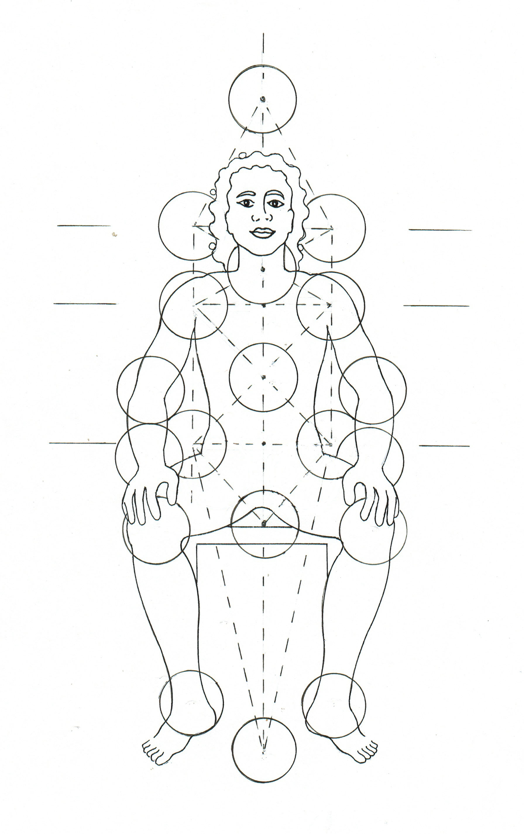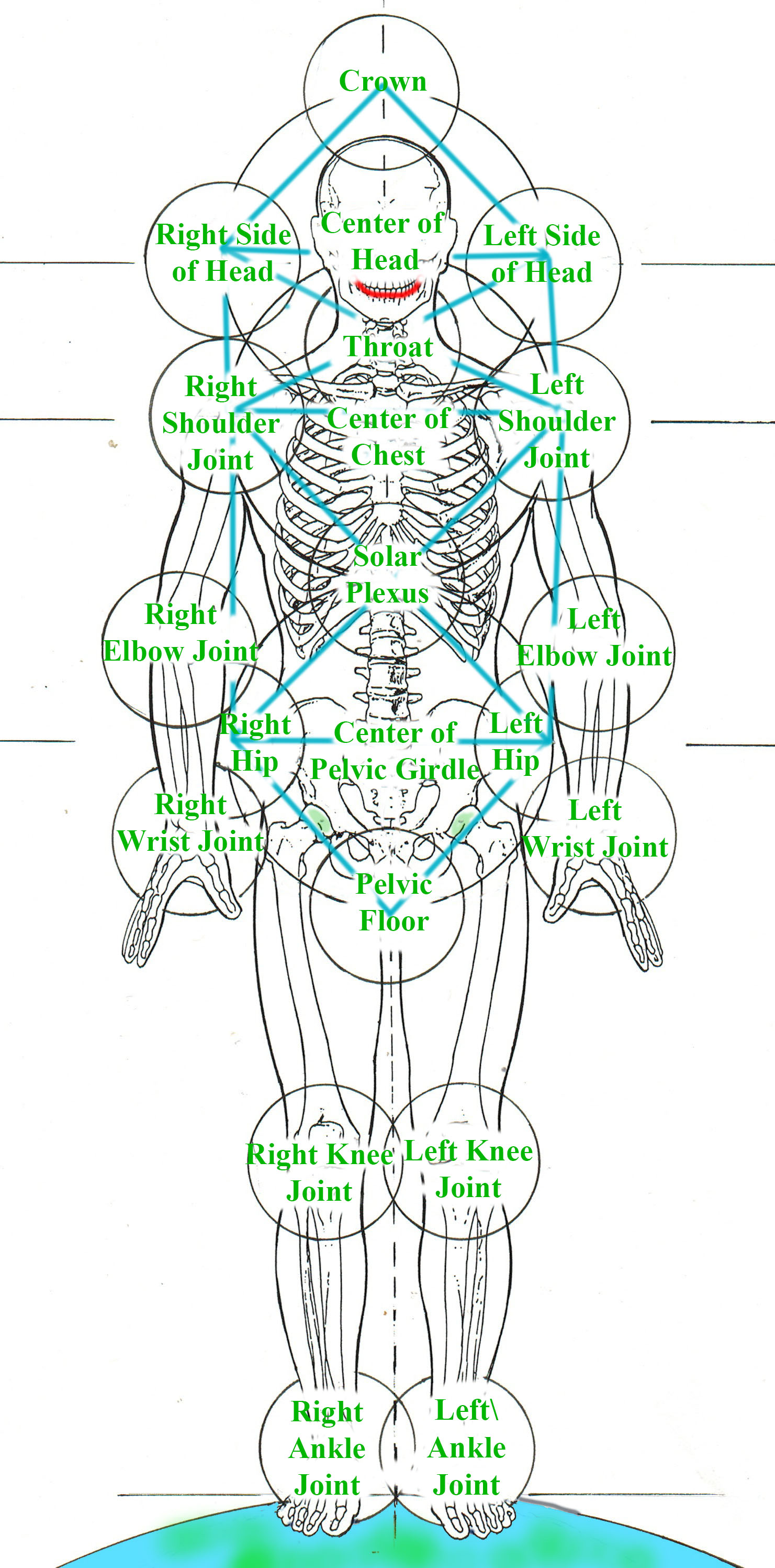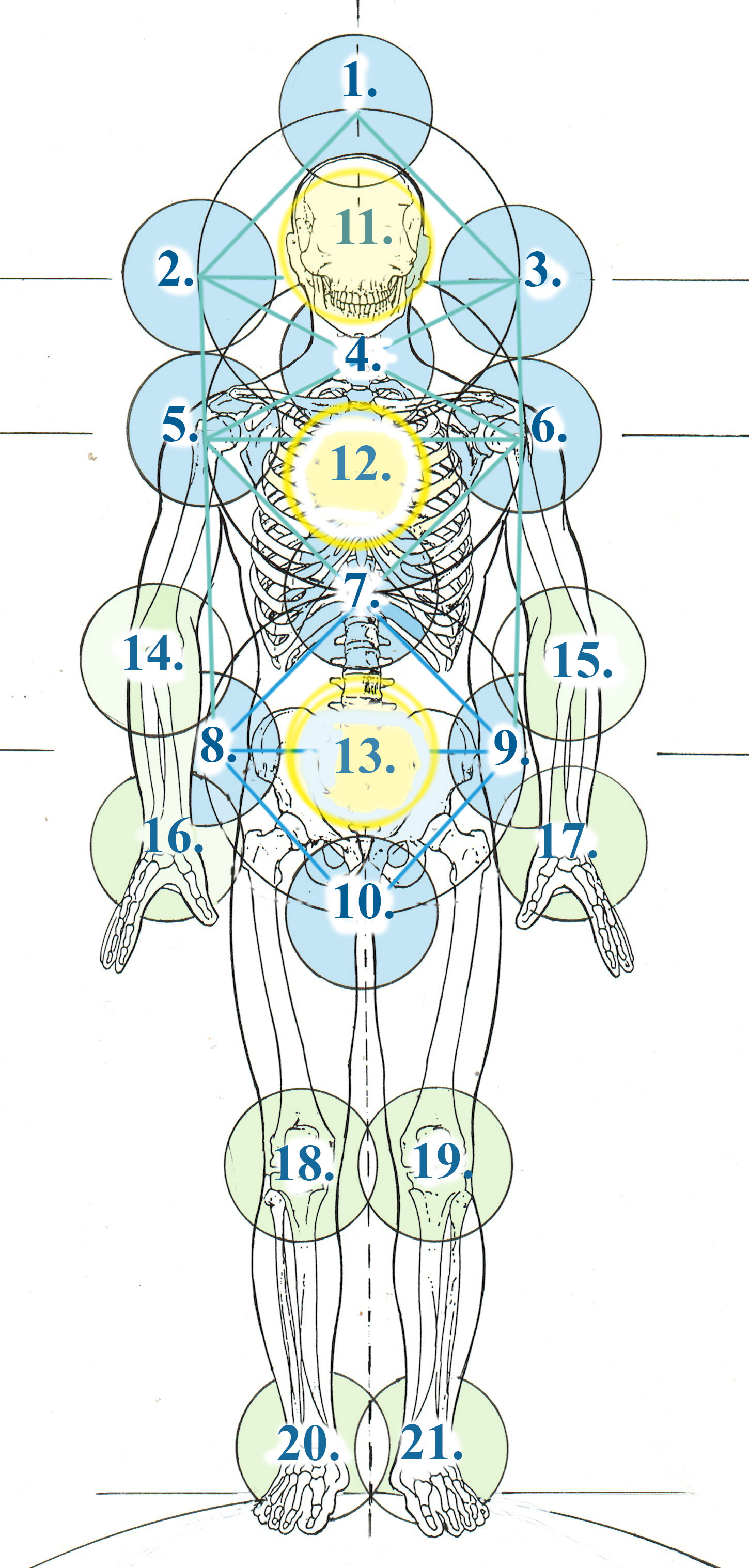 21 CENTERINGS NEW. with colorHere we have the Ten Dimensions in Blue,  The Three Senses of Self:  11. Mental – Center of the Head, 12. Emotional – Center of the Chest, 13. Physical –  Center of the Pelvis in yellow  Plus the elbow and wrist joints of the arms (4) and knee and ankle joints of the legs (4) in green.
