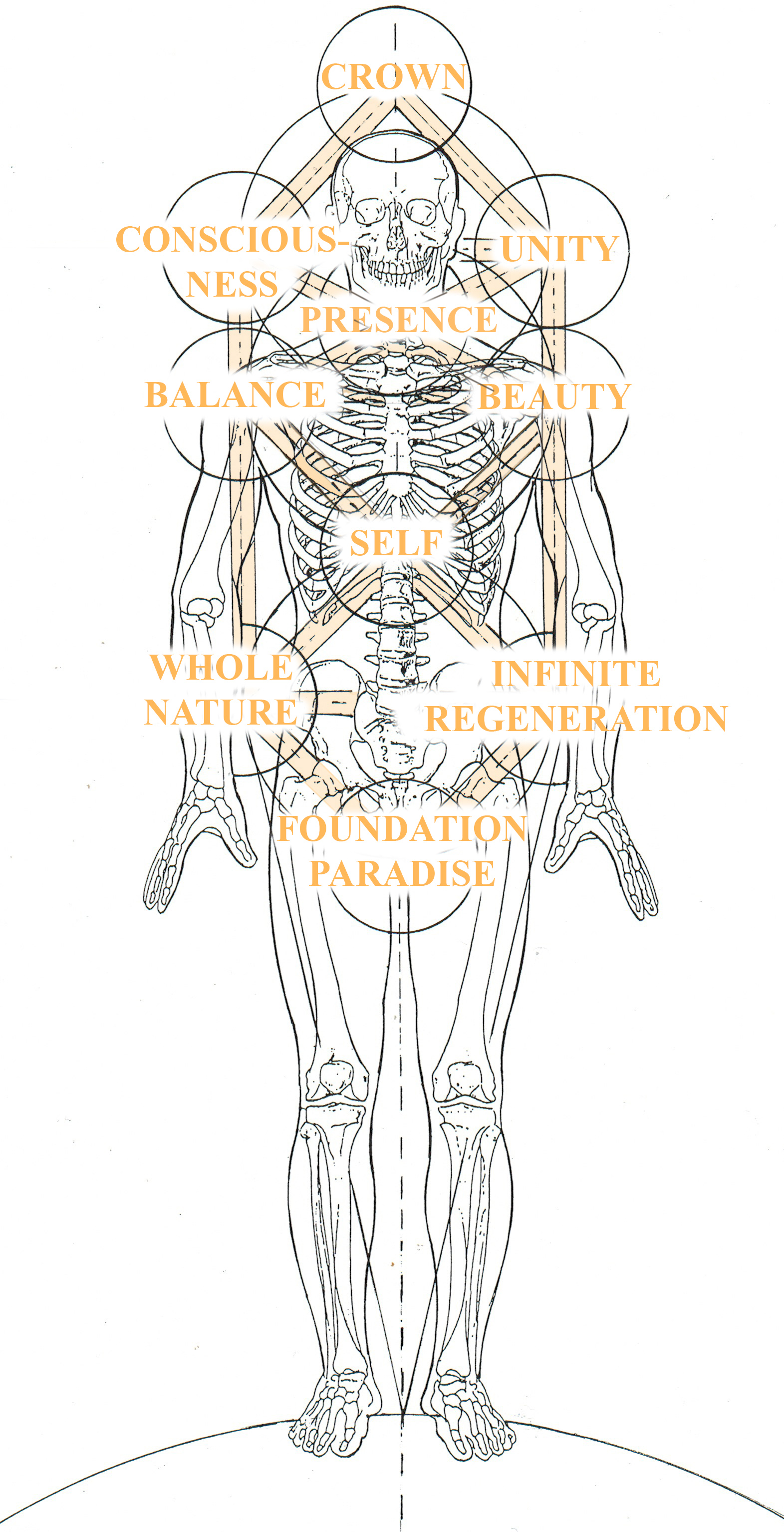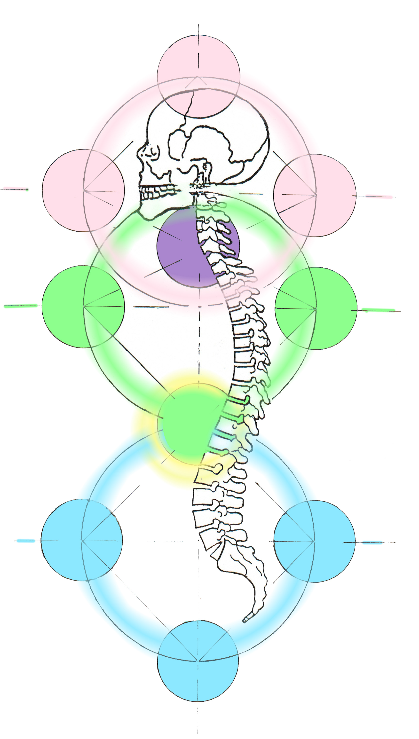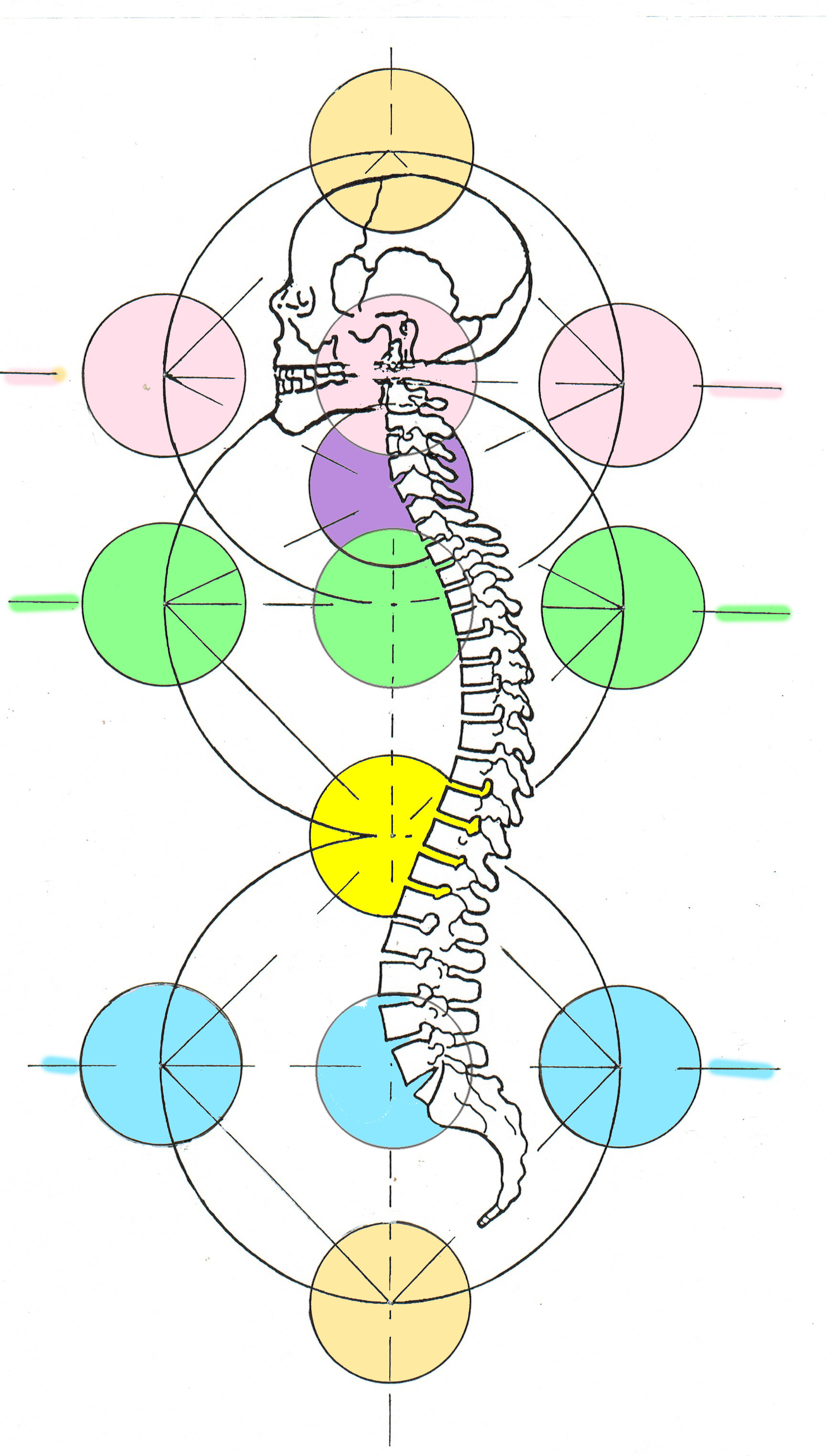 The seven physiological centers expressing, in vertical alignment the above and below directions of space as the above and below relate to the right and left, front and back directions,  enabling the three-dimensional natural extension of the spinal column.