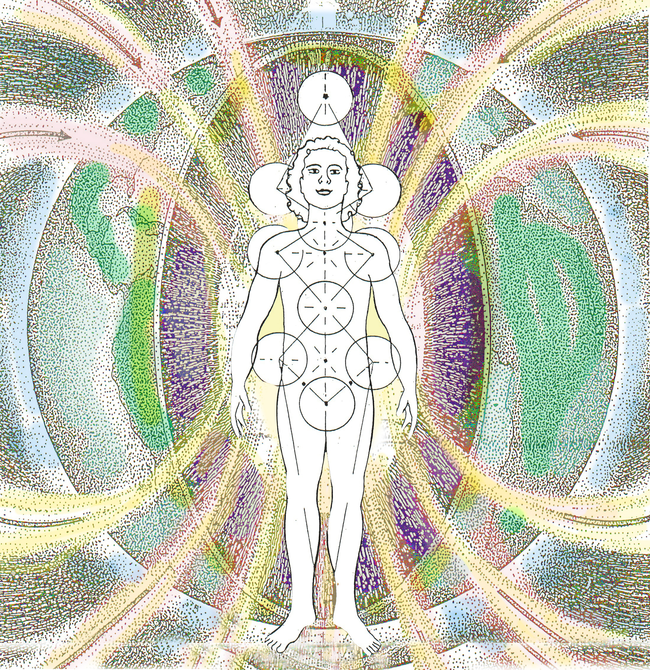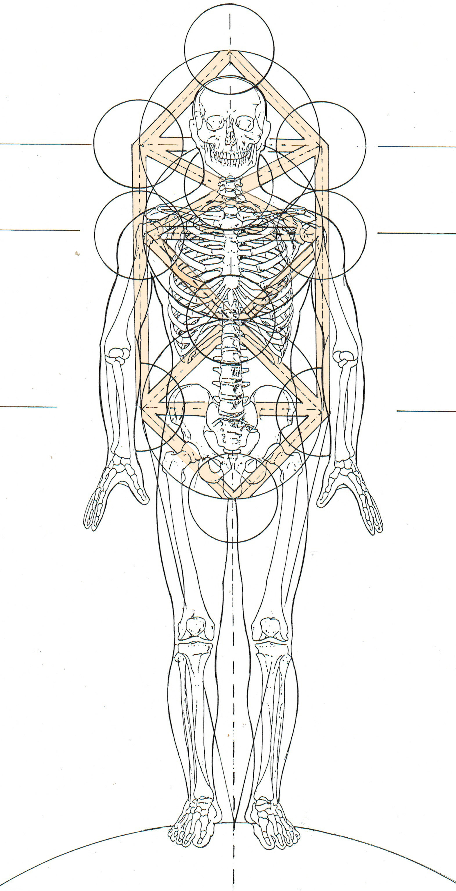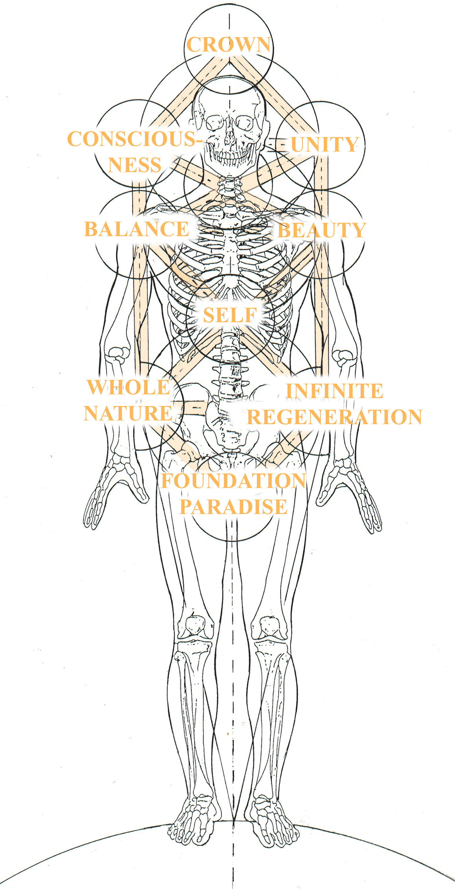 The seven physiological centers expressing, in vertical alignment the above and below directions of space as the above and below relate to the right and left, front and back directions,  enabling the three-dimensional natural extension of the spinal column.
