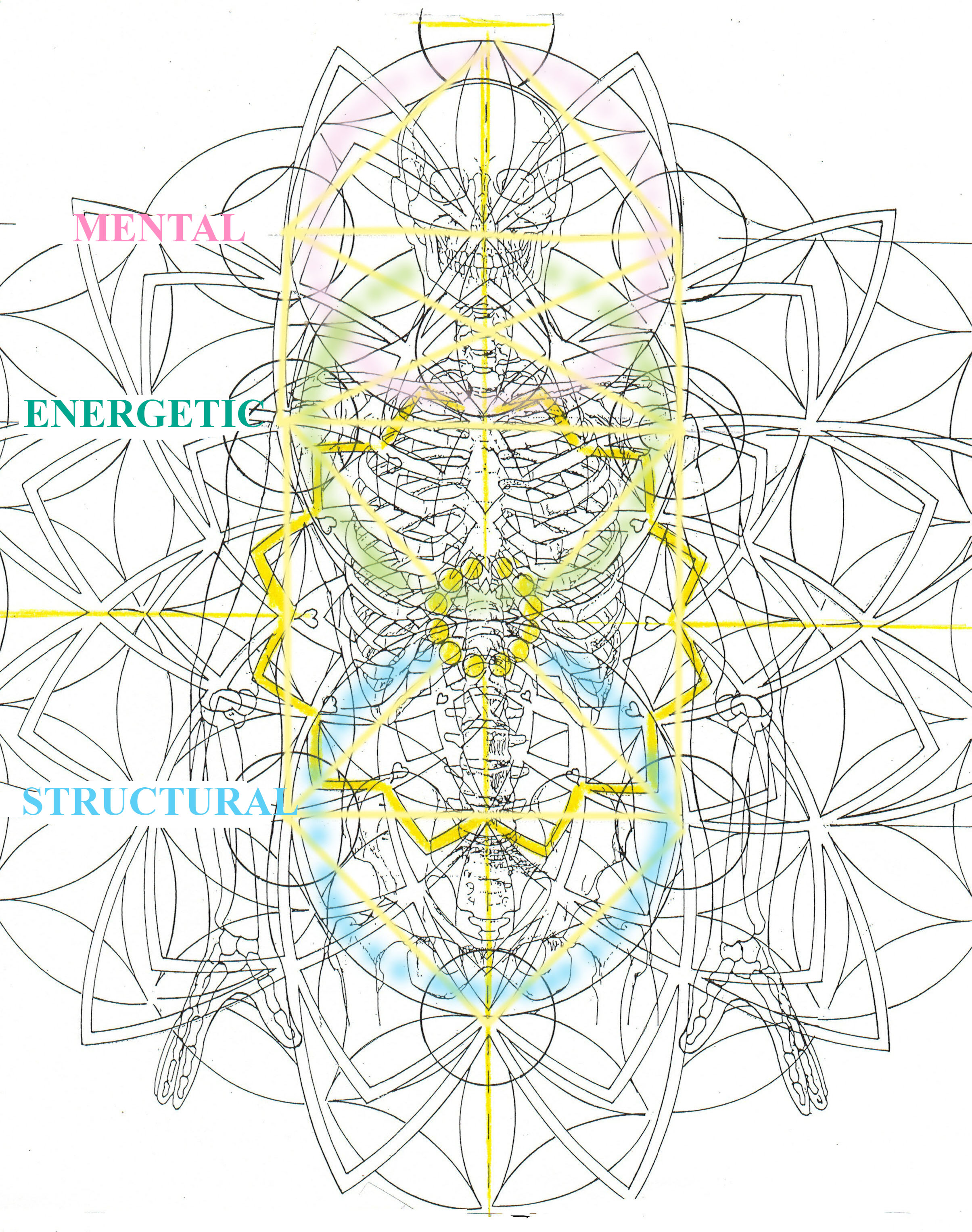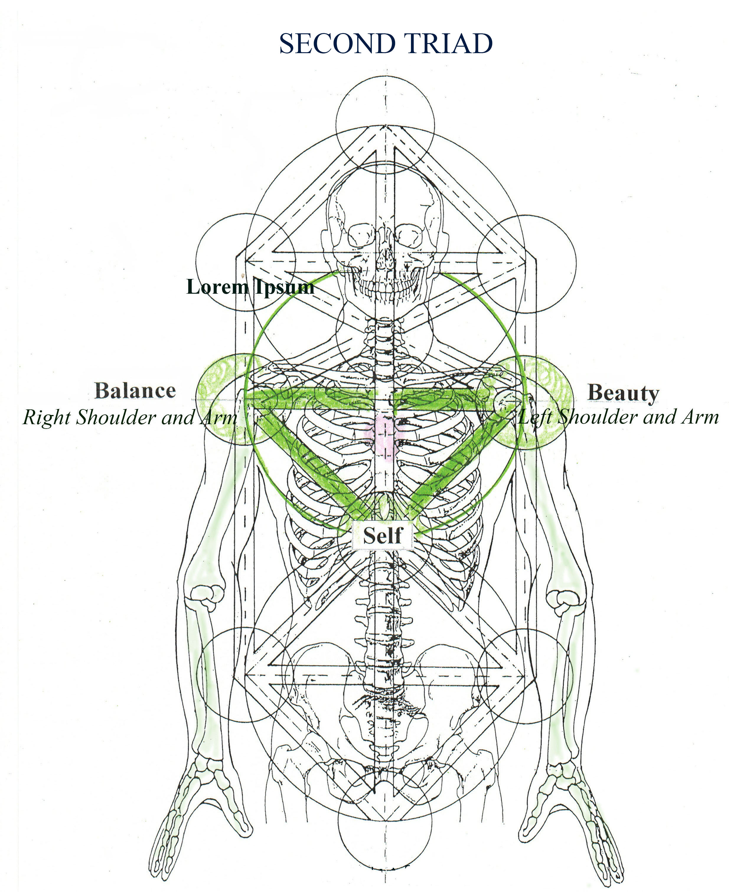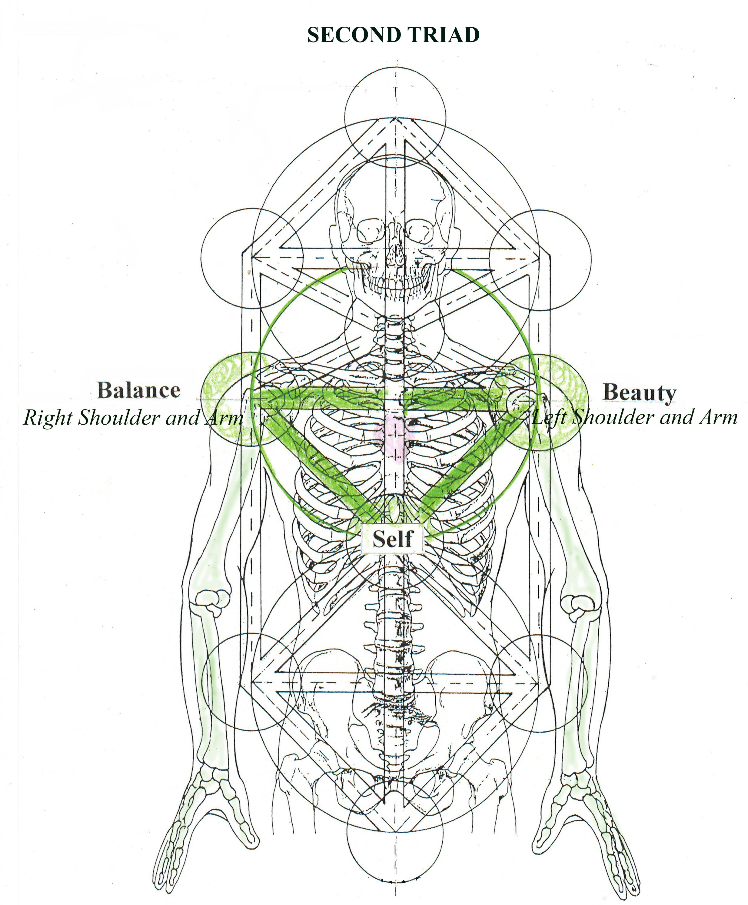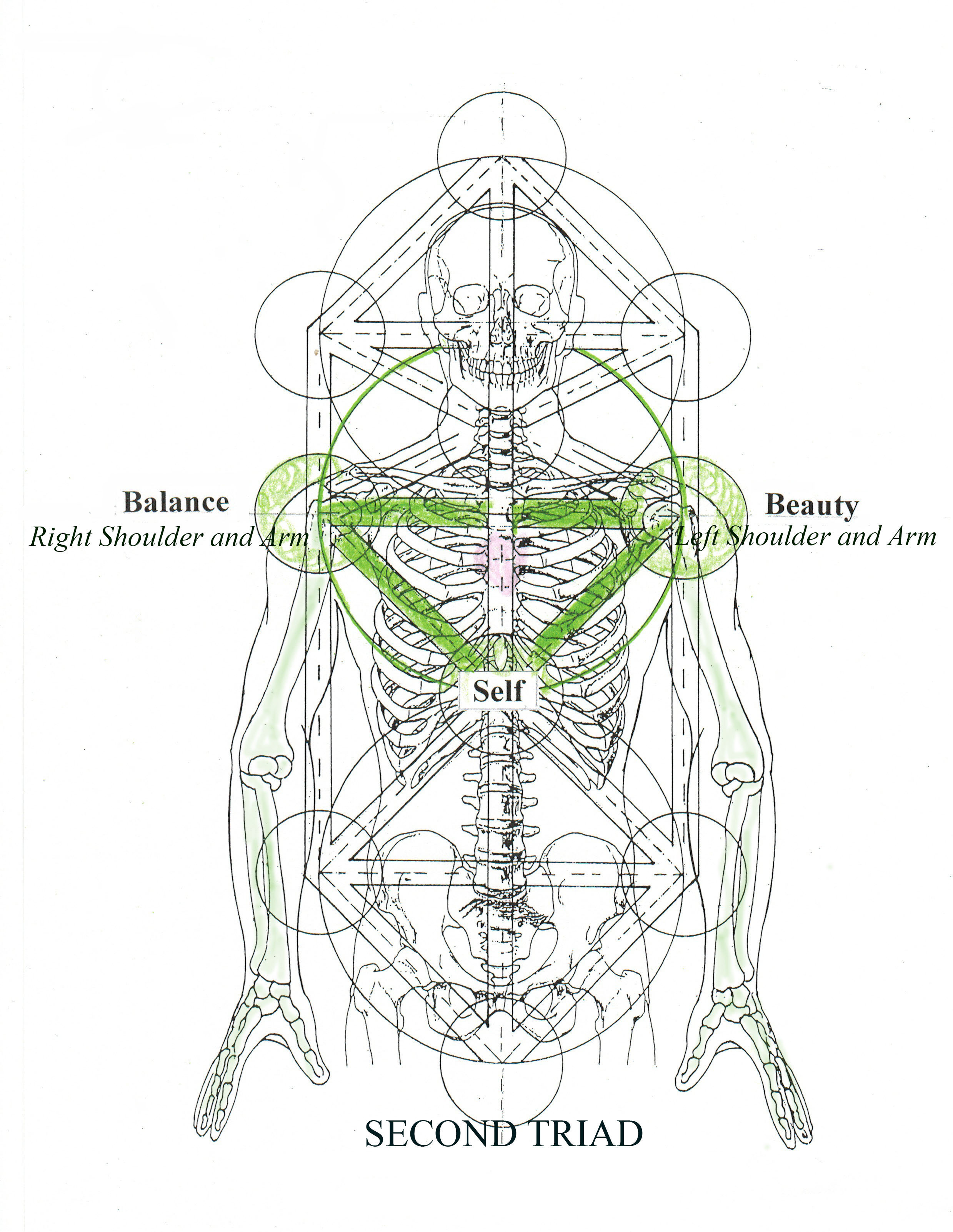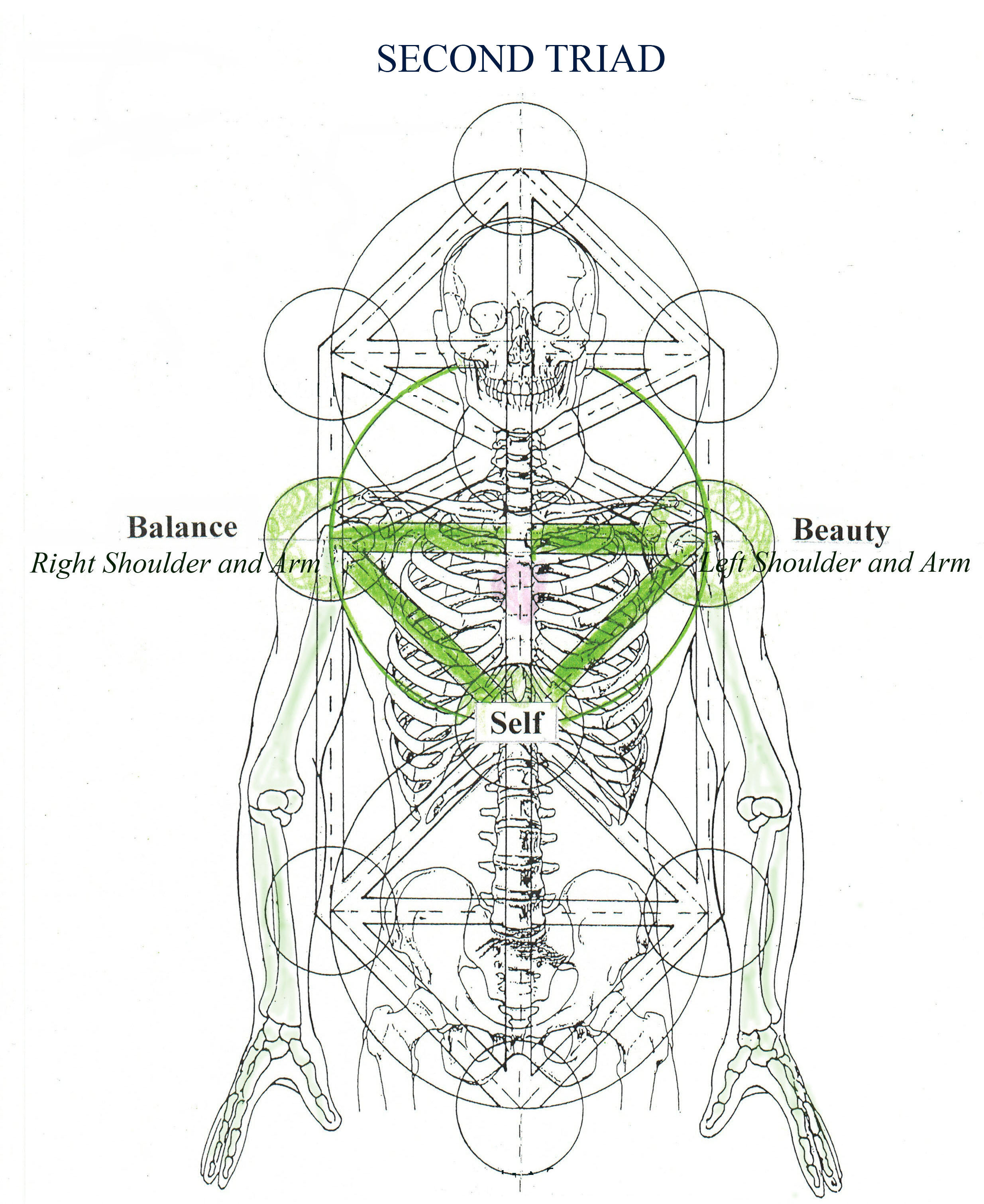 The Second Triad, as it relates to structure, is the unification of the right and left sides of the upper torso centralized by the shoulder girdle and arms at the center of the heart, and the centralization of the solar plexus expressing the natural extension of the whole spinal column.