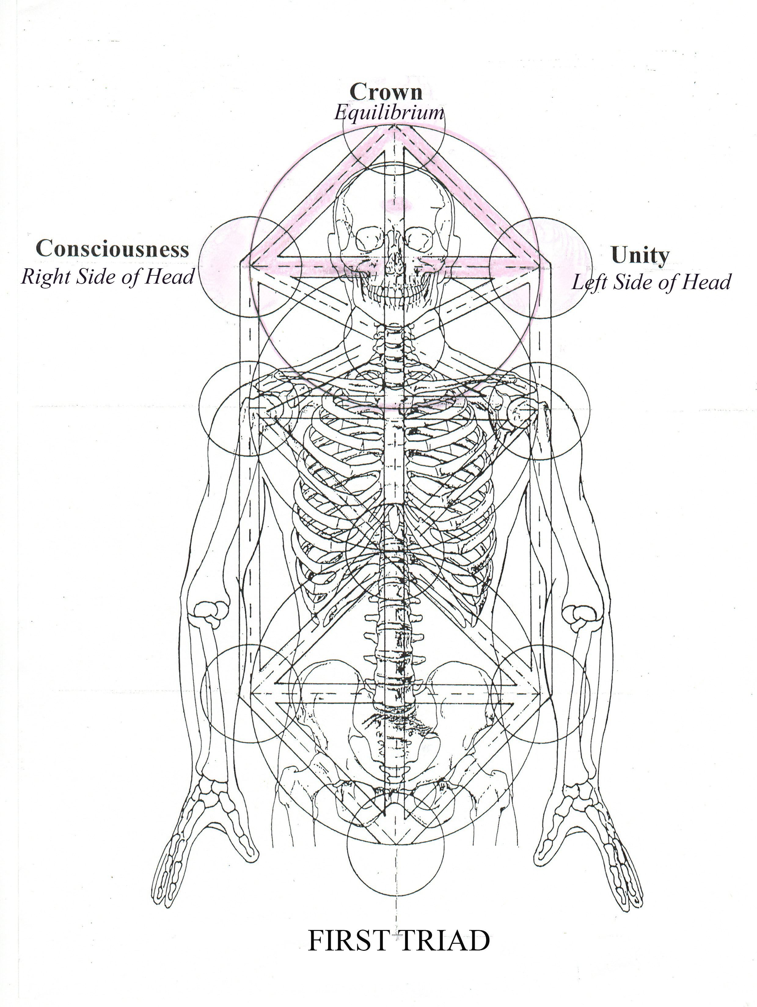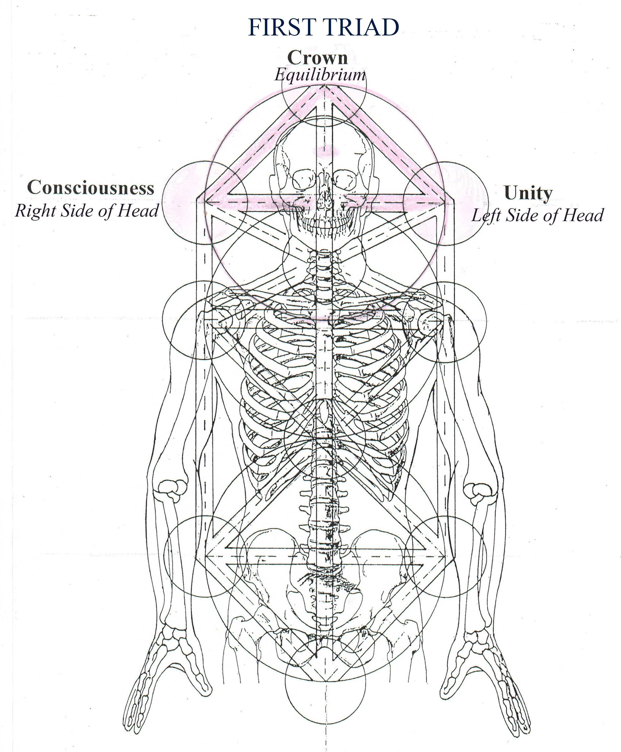 The First Triad as it relates to the structural formation of the human body is the unification of the right and left side of the head as it is centralized on top of the Atlas – within the spinal column – giving vertical direction to the center top of the head – the center of Self Equilibrium.