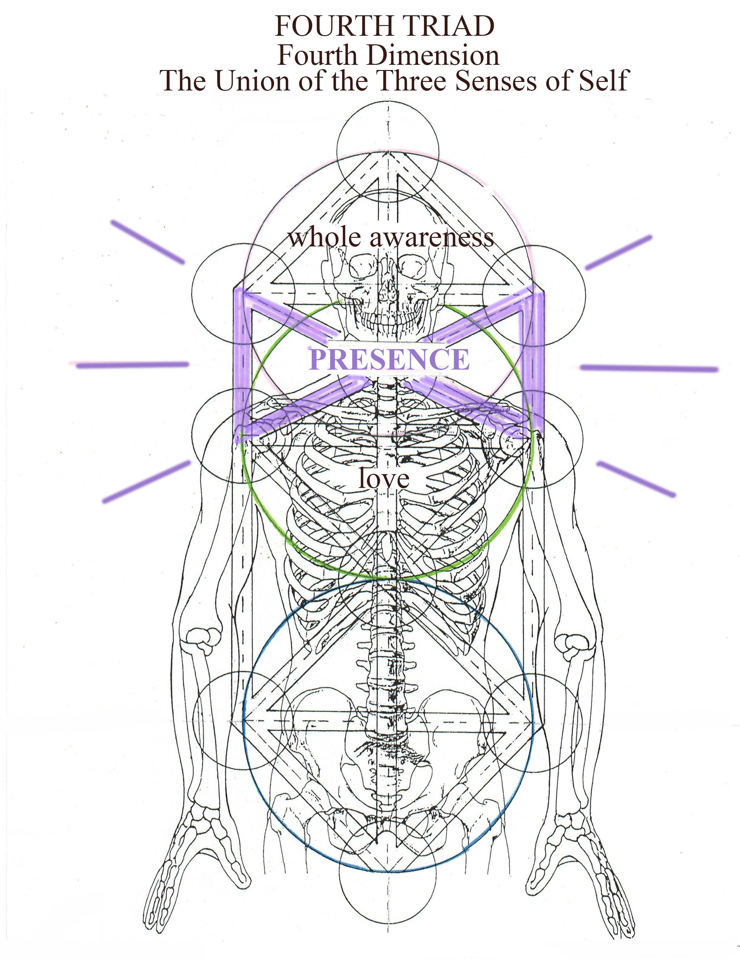 The Fourth Triad is the Unification of the First and Second Triad: Whole Awareness – The Whole Mind of life – and Love – The Boundless Feeling of Life, as these two Triads become united as One through The Fourth Dimension –Presence – expressing the Unity of Life.
